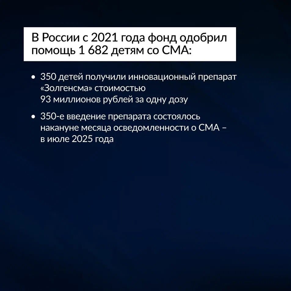 С 2021 года фонд помог уже 1682 детям со спинальной мышечной атрофией, из них 350 детей обеспечили инновационным генозаместительным препаратом.